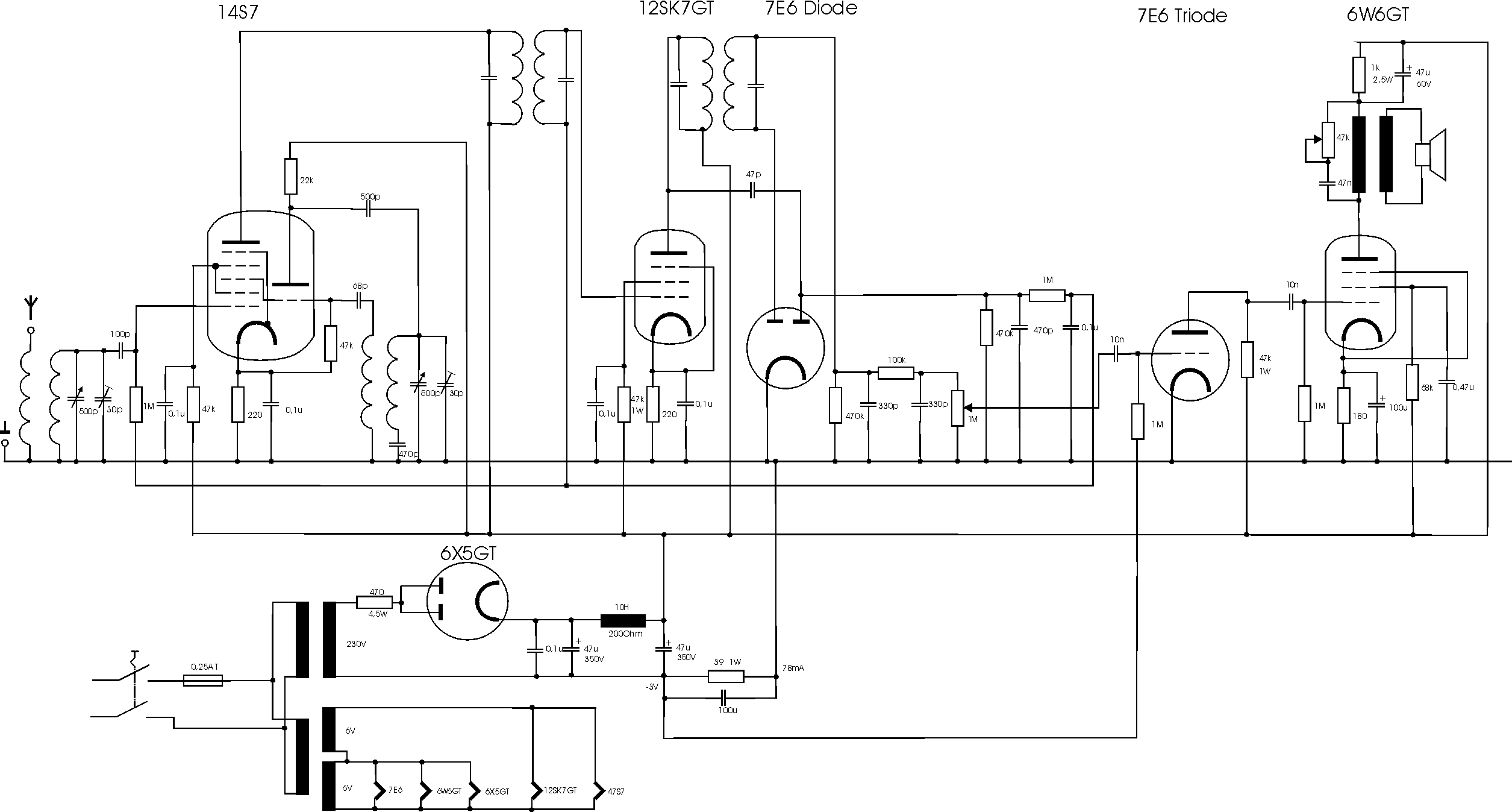 Entstanden ist ein MW-Super mit mit der 14S7 als Mischer, der 12SK7GT als ZF-Verstärker, der 7E6 als Demodulator und