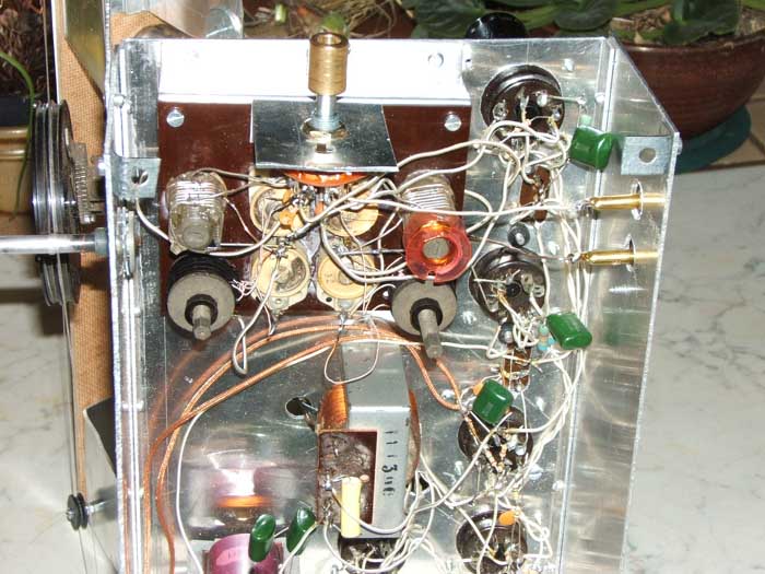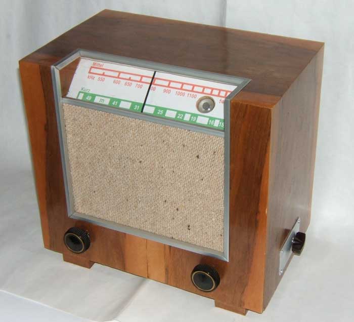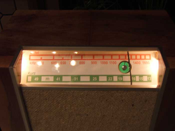 Der Wellenschalter wurde auf die Seite verlagert (wie bei vielen alten Radios) um vorne nur zwei Drehknöpfe zu haben.
