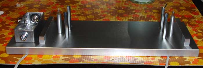 Was für ein schöner Anblick - sie funktionierte auf Anhieb. Aber es gibt noch zu tun - nämlich alle Schalter, LED und Buchsen wieder von der Platine entfernen und stattdessen Kabel für die Verlegung dieser Teile in die externe Schaltereinheit anlöten. Aus der schön aufgeräumten Urbach´schen Platine (inzwischen auf der Grundplatte montiert) entwickelte sich ein wüster Kabelsalat wie hier ersichtlich: