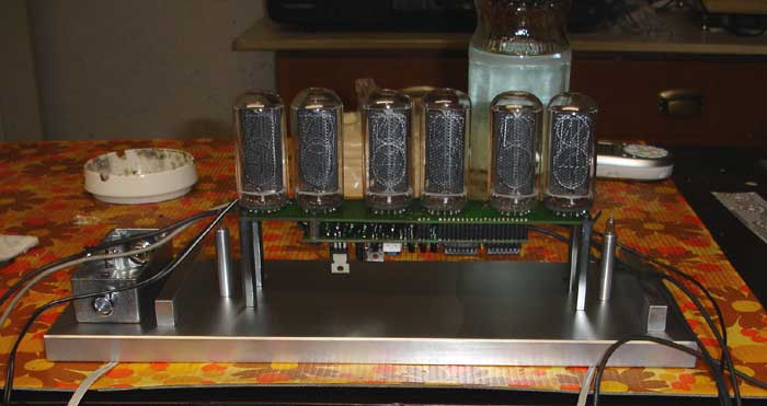 Die Röhrenplatine ist bei mir mittels Steckerleiste mit der Uhrenplatine verbunden und mit Abstands-bolzen verschraubt, die IN-18 werden über 66 auf die Röhrenplatine gelötete Mouser- Pins wie in eine Fassung gesteckt, das ergibt eine kompakte Einheit. Alles zusammen sieht dann so aus: