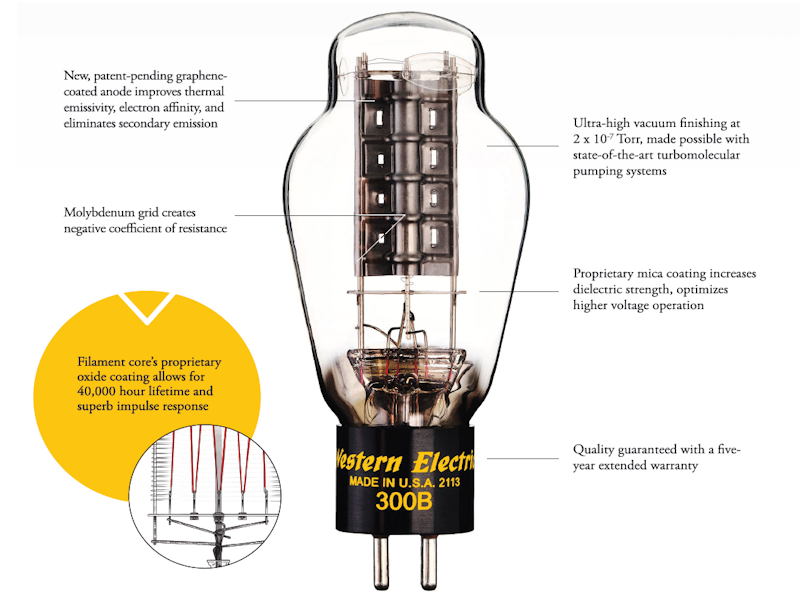 Western Electric, gegründet 1869 und 1996 neu ausgerichtet, widmet sich der Herstellung von Elektronenröhren und High-Fidelity-Produkten. Die berühmte 300B-Elektronenröhre wurde zum ersten Mal 1938 gefertigt und ist für ihre überragende Musikalität und Räumlichkeit bekannt. Heute wird die echte WE300B wieder originalgetreu im amerikanischen Werk „Rossville Works“ hergestellt. Modernisierte Produktionslinien sorgen für höchste Qualität.