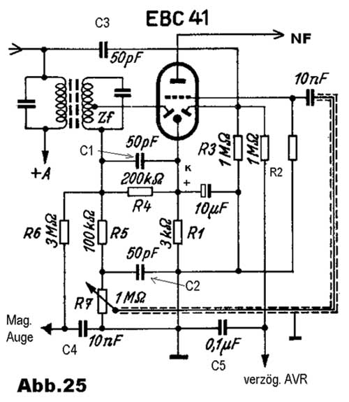 eine Schaltung mit der Duodiode-Triode EBC 41. Die linke Diode sorgt für die Rückgewinnung der Modulation.
