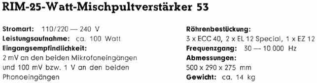 Der RIM-Mischpultverstärker 53 ist als Universalverstärker entworfen. Das heißt, er vereinigt eine Anzahl