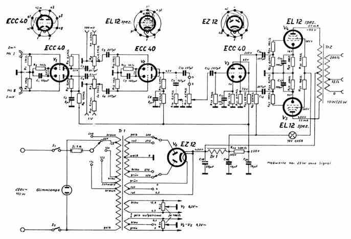 In der Gegentakt-Endstufe werden zwei Röhren EL12-Spezial verwendet. Damit läßt sich eine Sprechleistung von