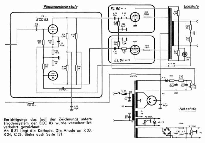 Die Gegentaktendstufe ist mit EL 84 bestückt, die auf einen Spezialgegentaktausgangstransformator arbeitet. Durch den