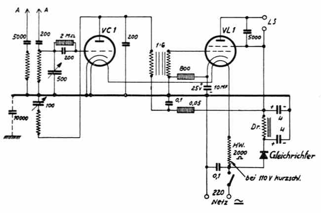 Das Gerät ist ein Einkreis-Zweiröhren-Empfänger mit Eisenkernspule, umschaltbar