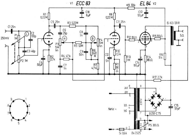Röhrenbestückung: ECC 83, EL 84, Selengleichrichter
