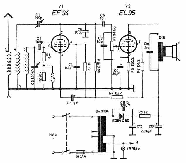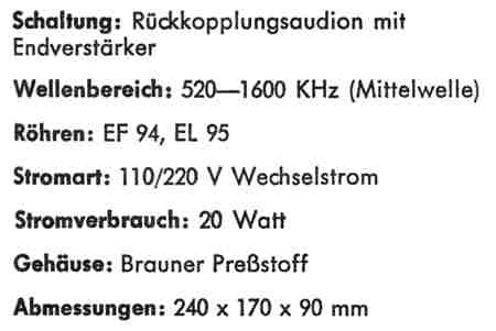 Schaltung Pentoden-Audion und Pentoden-Endstufe, wodurch eine sehr gute Verstärkung erreicht wird.