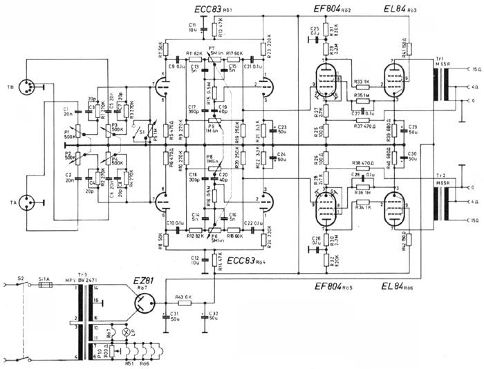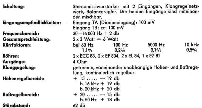 Röhre EF 804, Endstufe mit der Endröhre EL 84, Netzteil mit der Gleichrichterröhre EZ 81.