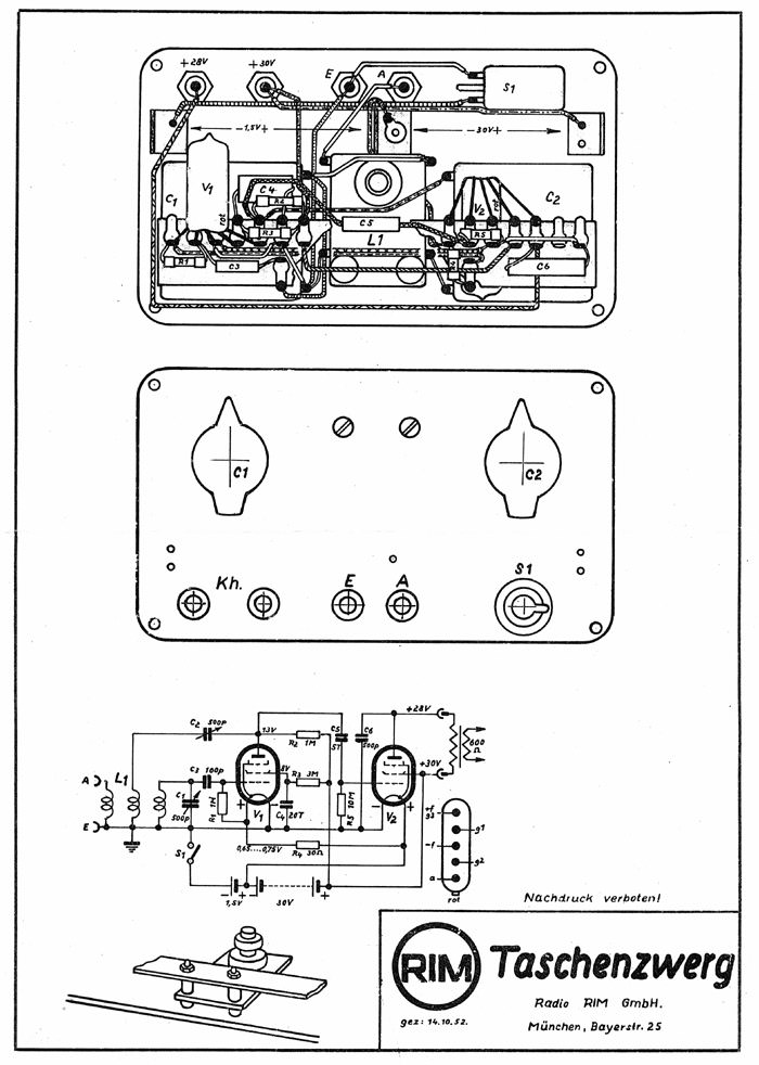 Ausführung geregelt. Aufbau und Verdrahtung Der Aufbau des Gerätes erfolgt auf einer vorgearbeiteten Pertinax-platte. Die Ecken kann man sich gegebenenfalls