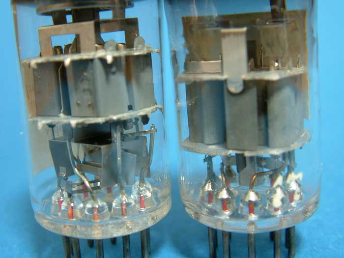 Diese NG-ECC im Vergleich neben einer anderen Spanngitterröhre, einer ECC88 von Valvo: