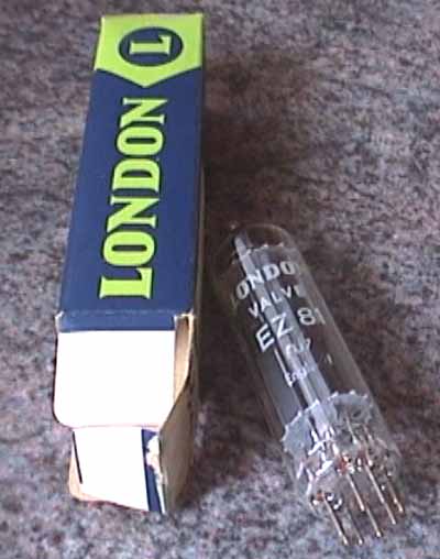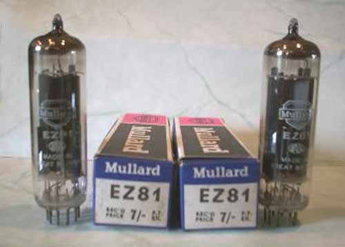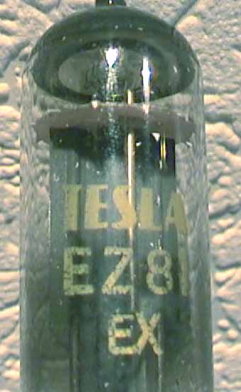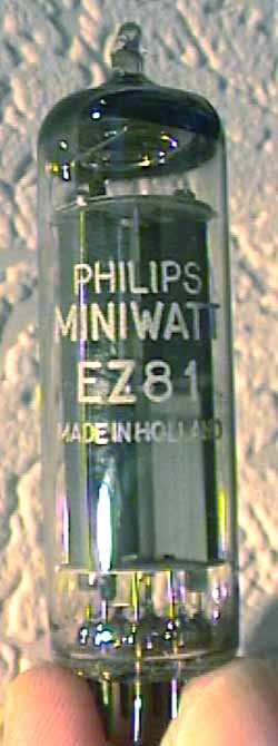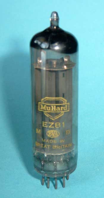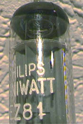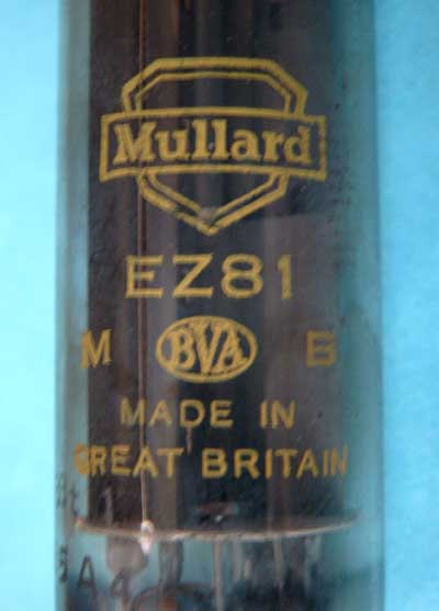 Von der englischen Philips-Tochter Mullard stammt diese EZ 81 (mit weisser Beschriftung) :