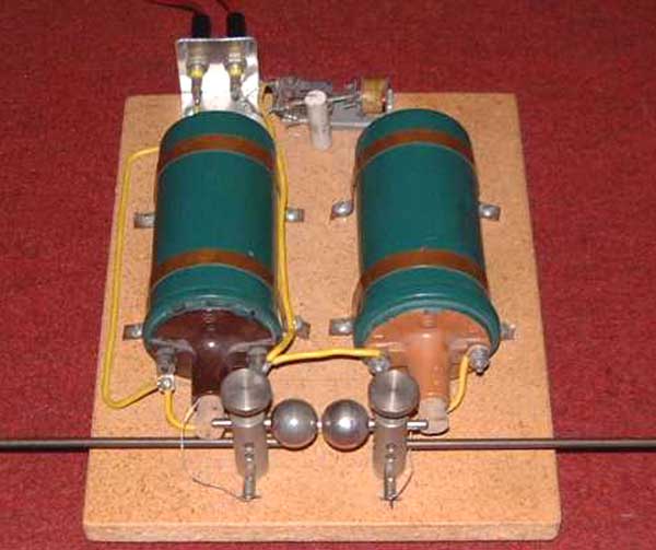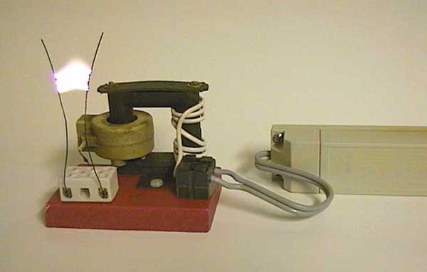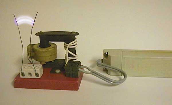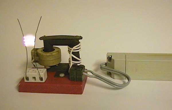 in ein kleines Gehäuse ein. Betrieben wird sie mit einem 230 Volt - Funkeninduktor. Mein Bekannter überließ