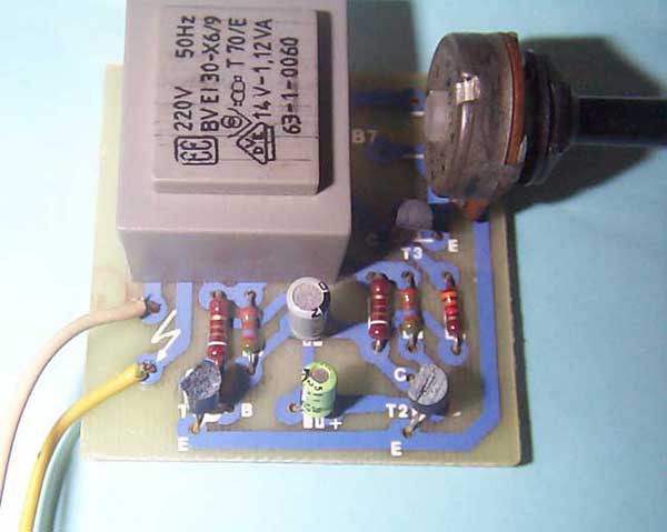 Ferrittransformator setzt die entstehende mit 100 Hz amplitudenmodulierte Spannung auf 12 Veff um und besorgt die