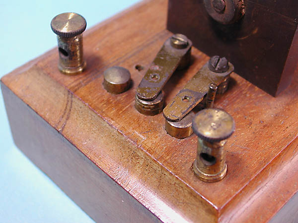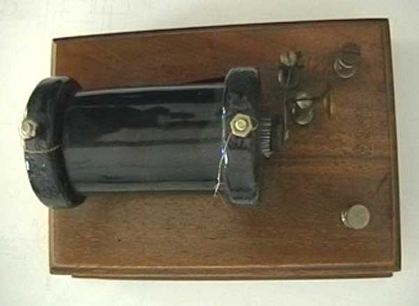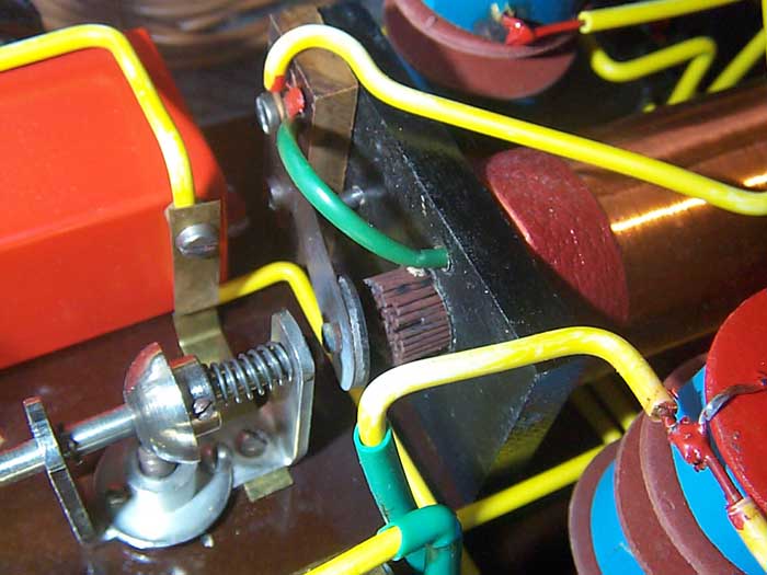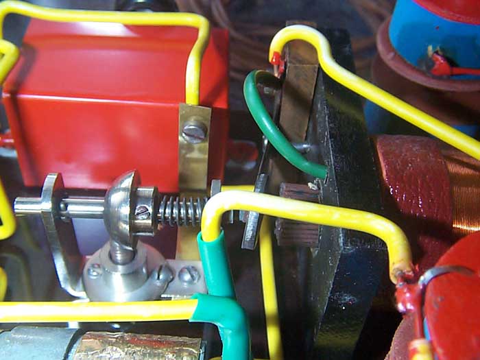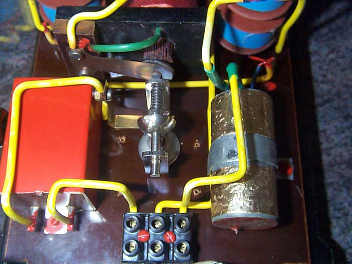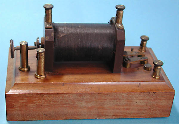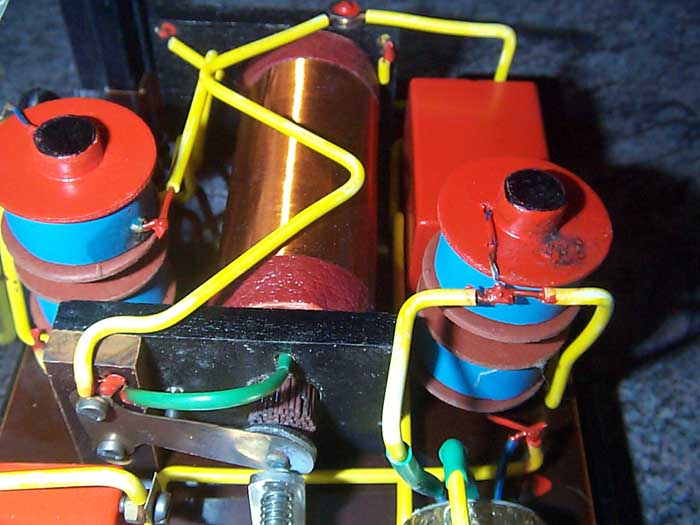 Vor dem kleinen Kasten erkennt man (Bildmitte) die Unterbrecher-Kontakte (Wagnerscher Hammer)