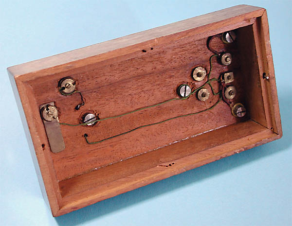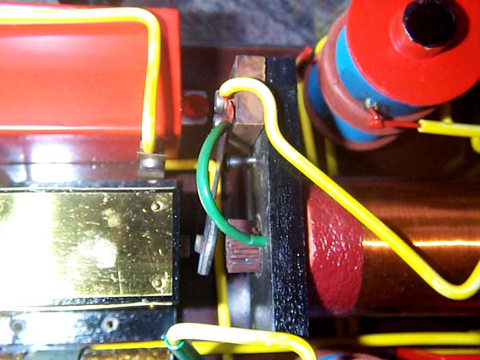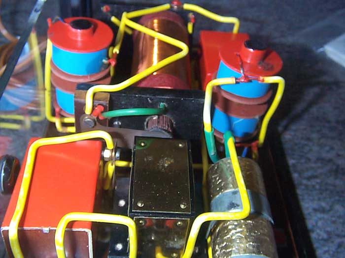 Der Funkeninduktor ist von der Unterseite erkennbar, das ganze ist, mitsamt dem Funkenlöschkondensator (der