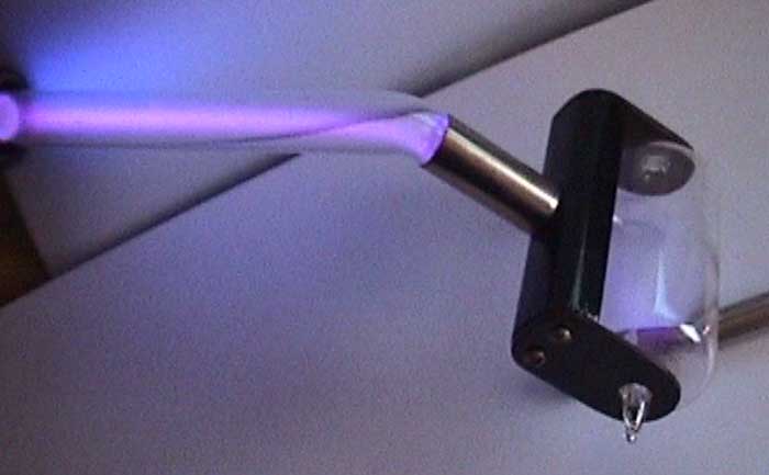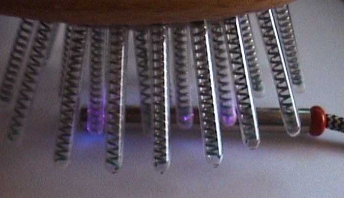 Glasrohre hatten auf einer Seite einen Elektrodenanschluß welcher in den Tesla-Spulenhalter eingeführt wurde.
