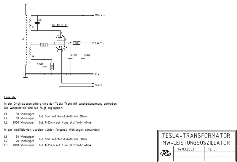 Das folgende Bild zeigt die Schaltungsskizze dieses Gerätes. Die rechte Seite der Skizze zeigen die Tesla-Spule.
