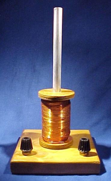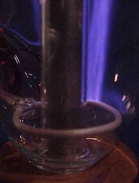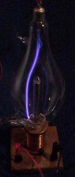 um den Kern des im unteren Teil der Röhre befindlichen Elektromagneten rotiert (Rotation des Funkenstroms).