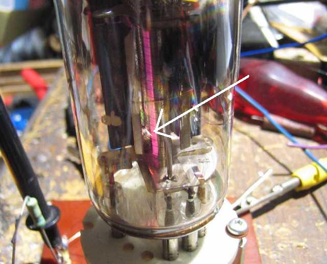 Die beiden folgenden Fotos, von Gert ins Forum gestellt, zeigt ein g2-glühen dieser Röhre. Gert schrieb dazu u.a.: