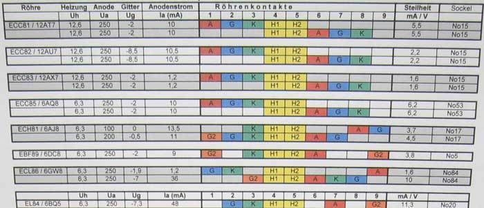 und am Röhrenprüfgerät eingestellt. Ein Datenblatt mit einer Farbcodierung der Röhrenelektroden der