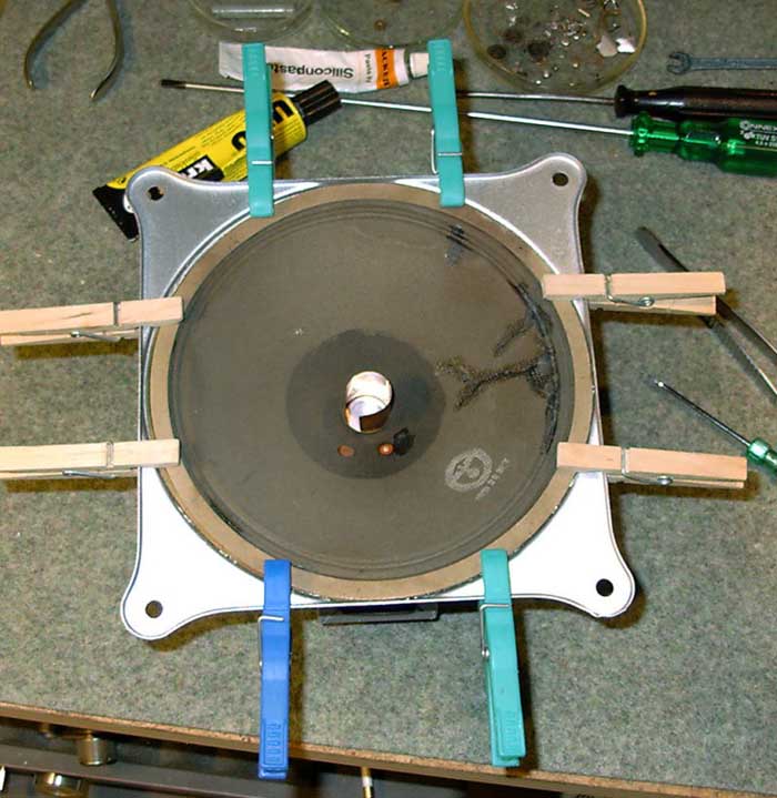 Die flexiblen Drähte, die zur Membran gehen werden am Chassis abgelötet. Nun wird die Membran mit einem passenden