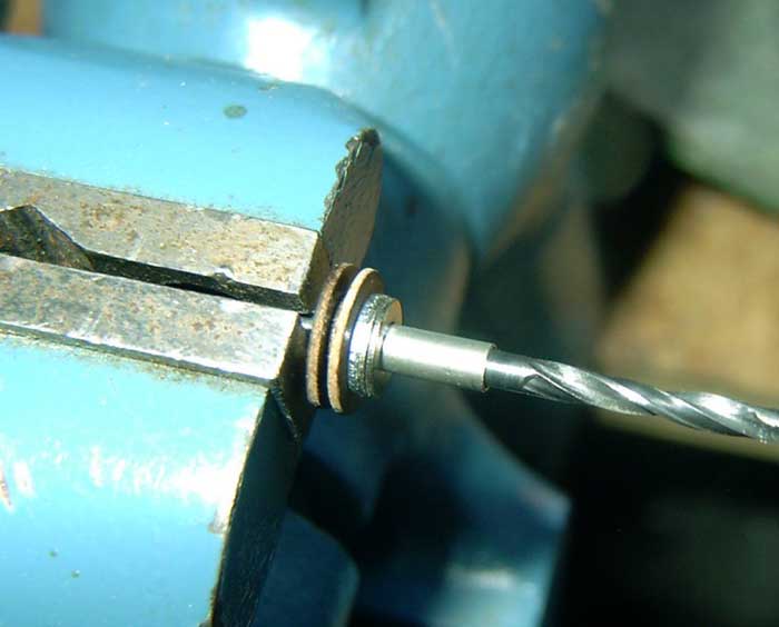 Unterlegscheiben ein. In einen Schraubstock spannen wir einen 2mm Bohrer ein und schieben das Ganze darauf.