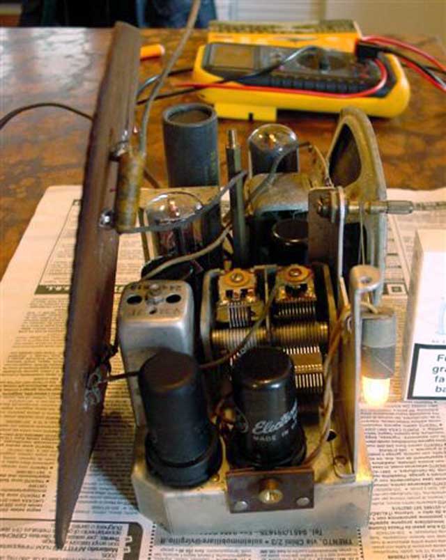 35Z5GT-Gleichrichter. Die Skalenlampe ist eine GE47 (Standard US-Lämpchen), das aus der Anzapfung der Heizung der