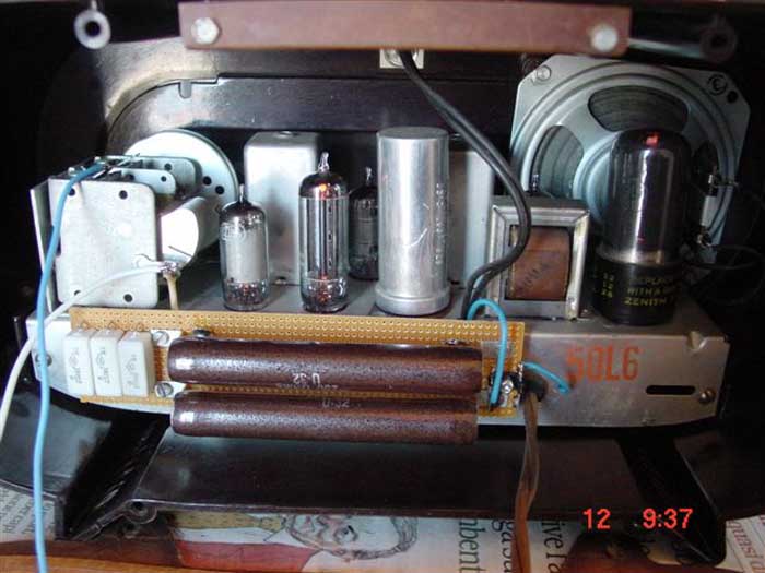 Die Bestückung ist Standard: 50L6GT, 12AT6, 12BA6,12BE6 und 35W4. - Fehlt noch die Skalenlampe Typ 47 (6,3V-0,15A
