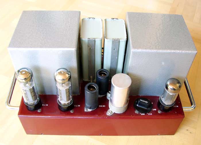 Vorstufe und Phasensplitter sind mit der abgeschirmten Pentode EF86 und der Doppeltriode ECC83 realisiert. In der Endstufe