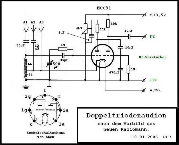 Da die ECC91 sich im einfachen Triodenaudion gut behauptet hat, warum nicht auch den neuen, aktuellen Radiomann nachbauen -