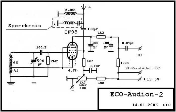 EF98-ECO-Aufbau 2; ECO-Audion mit der Pentode EF98 und Antenneneinspeisung über das Schirmgitter