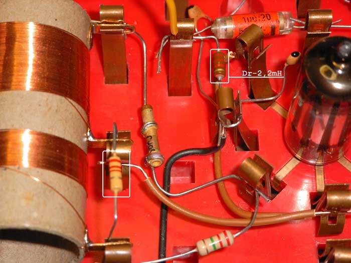 Im letzten Bild noch mal markiert der Widerstand 2k2 zum bedämpfen der Rückkopplung und die Hf-Drossel 2,2mH, die