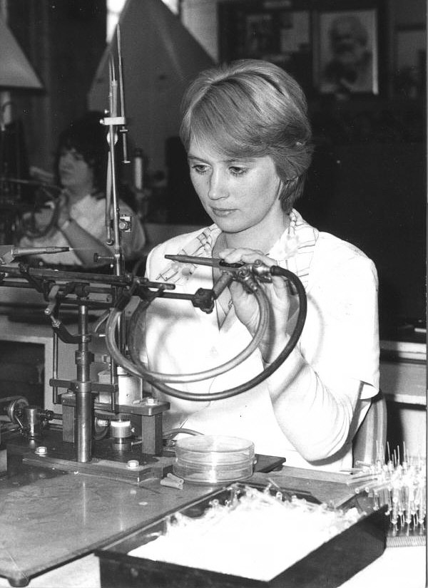 Kollegin beim einschmelzen von Anoden und Katoden in Blitzröhren mit seitlichem Pumpstutzen.