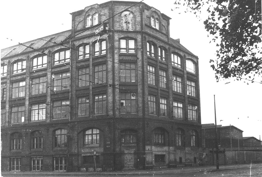 Berliner Strasse/Ecke Apelstrasse, Gebäude mit Fahrradfahrerskulptur im 5.Stockwerk.