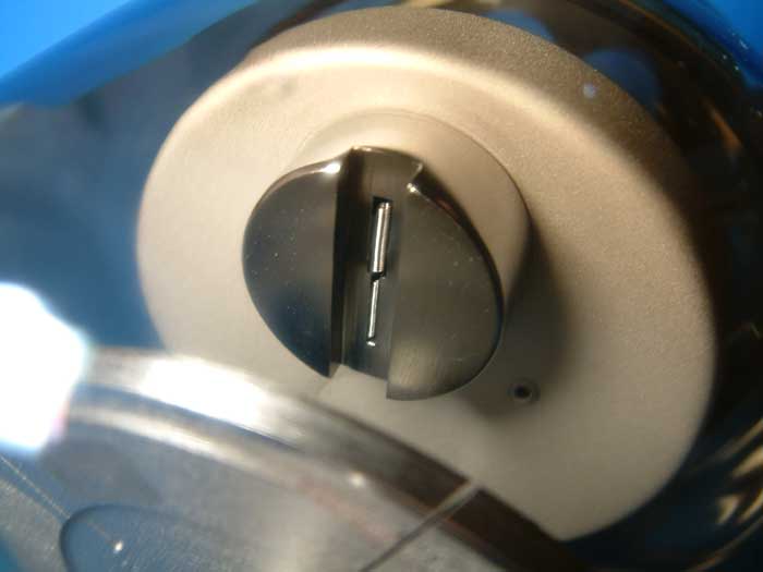 In der Öffnung sind zwei Anschlüss-Stifte (Heizung), einer davon steht frei in der Öffnungsmitte, der