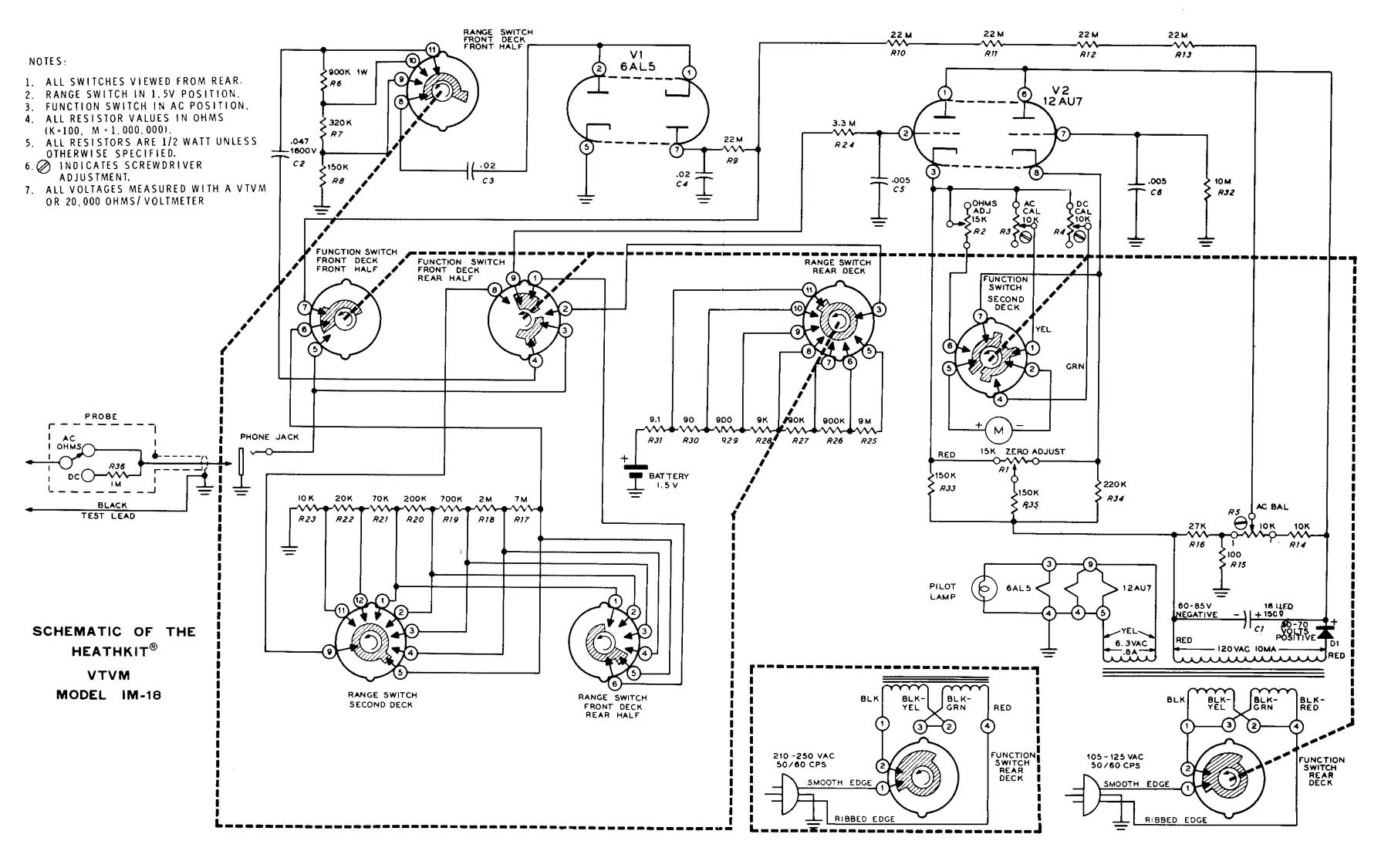 Das Schaltbild zeigt den IM-18, der sich nur mit seinem Netztransformator (110 V) vom IM-18D (220 V) unterscheidet.