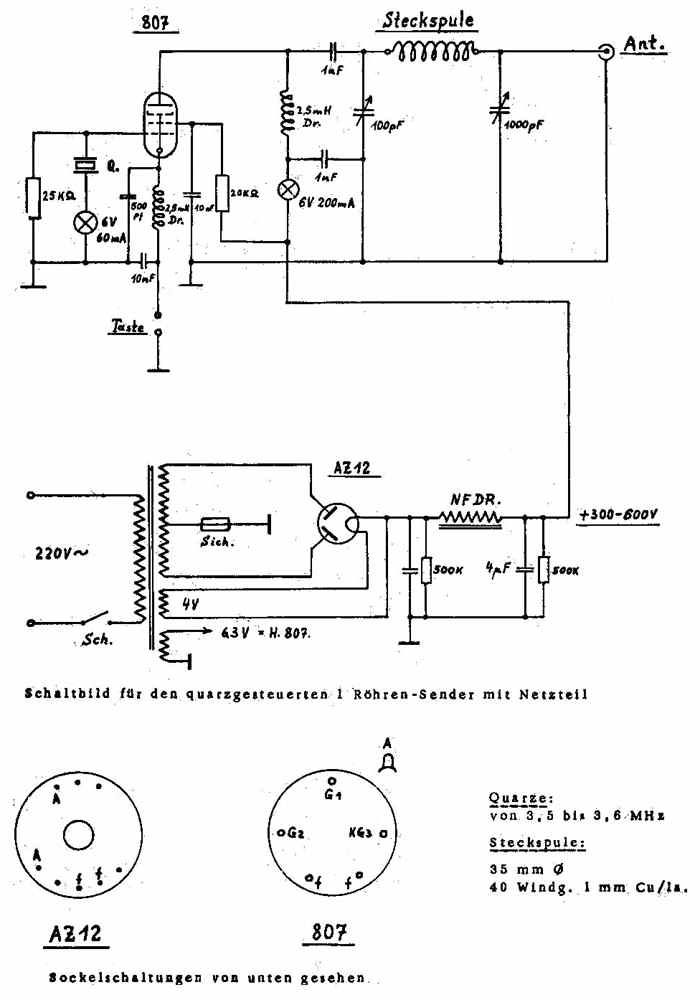 Die Schaltung weist keine Besonderheiten auf. Als Senderöhre wird die amerikanische Röhre 807 verwendet,