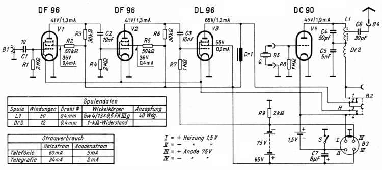 Frequenzvervielfachung auskommen. Im Gitterkreis der DC 90 liegt der Steuerquarz (Frequenz etwa 3,6 MHz), auf dessen