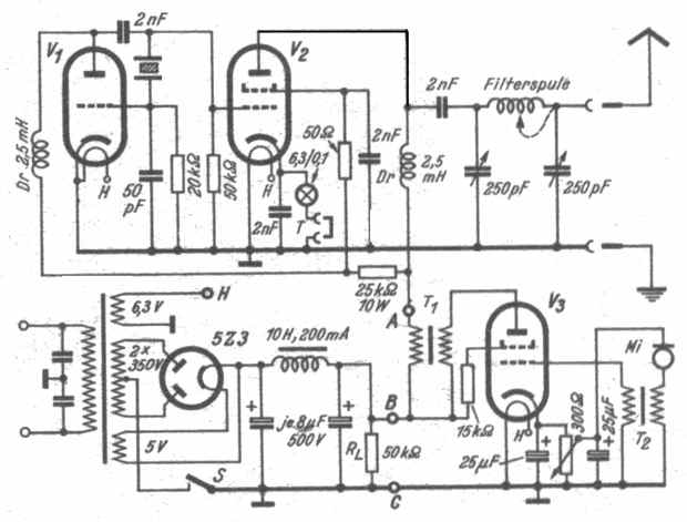Die Anodenspannung für den Oszillator V1 und die Schirmgitterspannung von V2 soll 280 V nicht überschreiten.
