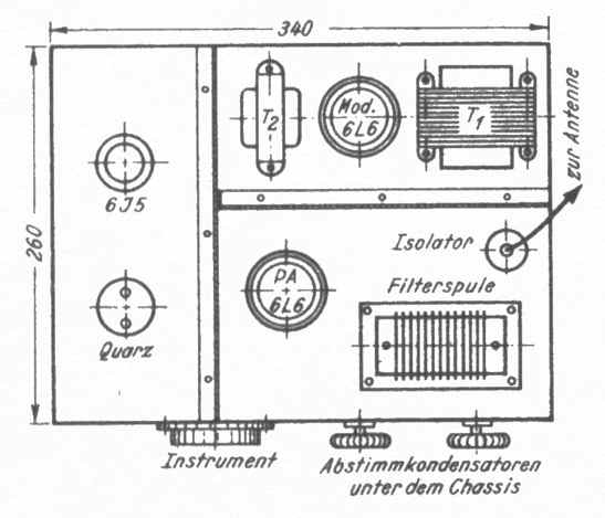 Der Sender ist auf einem Aluminiumchassis mit den Abmessungen 340 x 260 x 70 mm aufgebaut. Die Anordnung der Teile ist