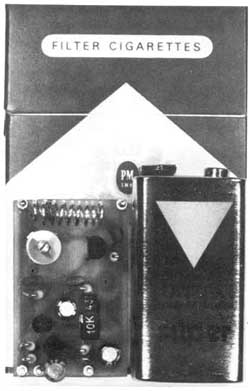 Die Abmessungen der gesamten Schaltung sind so gering, daß sie einschließlich Mikrofon und 9 V-Blockbatterie in