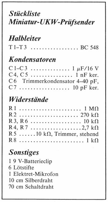 Die für diesen kleinen und einfach aufzubauenden UKW-Prüfsender erforderlichen Bauelemente, werden sicherlich viele