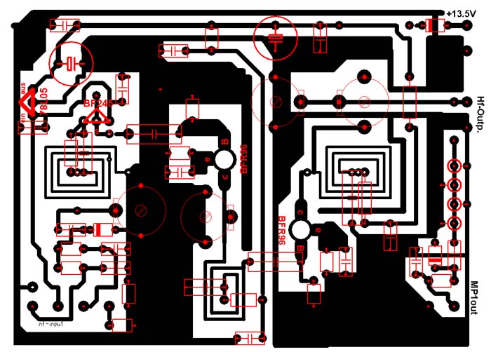 Messen Sie die HF-Spannung am Antennenausgang und stellen Sie mit Hilfe der beiden gelben Trimmer (Nähe Antennenkabel)