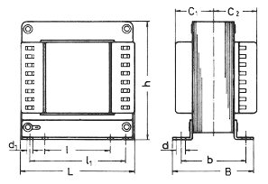 Technische Daten: Ausführung nach VDE 0550 Vorbereitet für Geräte der Schutzklasse I Schutzart IP 00 Isolierstoffklasse E Nennumgebungstemperatur ta 40°C Befestigungswinkel, Befestigungsrahmen und Lötösen Trafohauben auf Anfrage lieferbar |