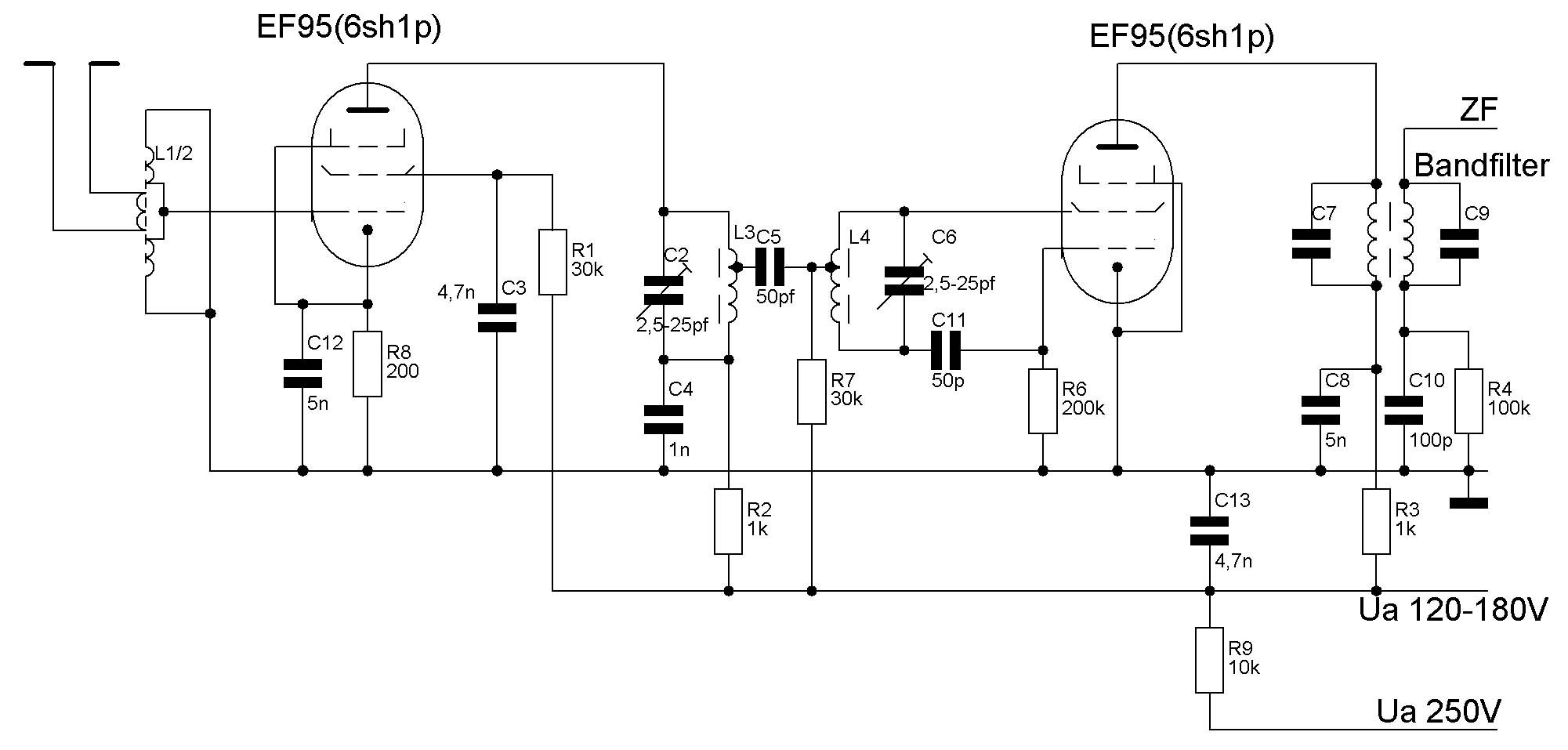 dann endgültig auf die 6SH1P (EF95). Laut Datenblatt (Röhrentaschenbuch Band 1 Fachbuchverlag Leipzig 1958) ist