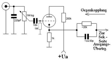 arbeitet die Triode als Kathodenbasisstufe. Über einen Kondensator von 0,5 µF liegt die Ausgangsspannung an einer