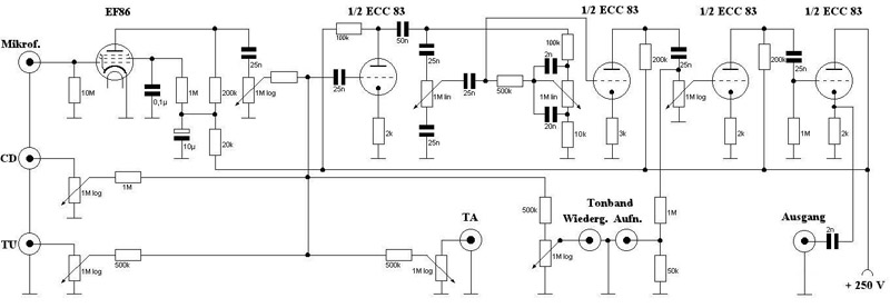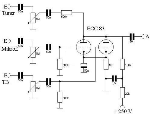 Es ist eine Mischschaltung für die jeweiligen Eingänge Tuner, Mikrofon und Tonband mit getrennter Verstärkung