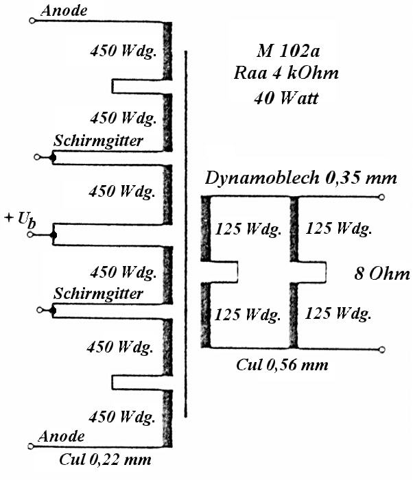 Für die Sekundärwicklung werden für die 16-Ohm-Wicklung 370 Wdg 1,1 mm Cul; für eine 8-Ohm-Wicklung