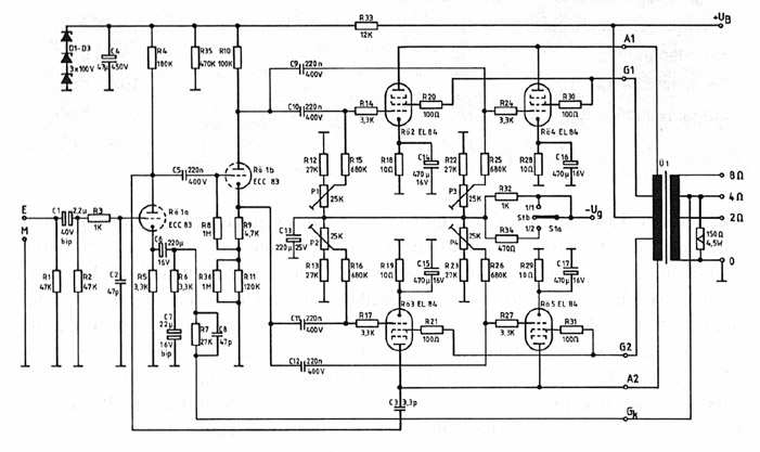 Auch diese Schaltung arbeitet mit 4 x EL 84 in Ultralinearer Schaltung, soll angeblich 40 Watt Leistung bringen.